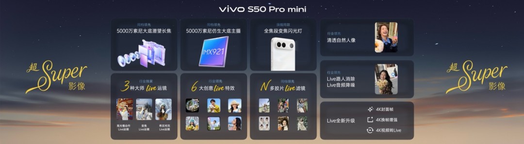 vivo S50 Pro mini更配备了索尼IMX921超感光主摄与多焦段变焦闪光灯,进一步强化了夜景人像实力。
