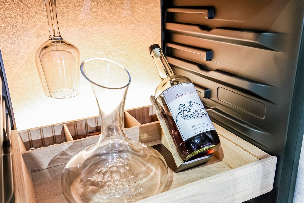 此外,醇韵酒柜在体验上也颇为考究。当酒柜通过雷达监测到用户接近,灯光亮起,藏酒尽显眼前,方便查看藏酒的同时还能为生活添加一份仪式感。轻敲柜门后,柜门自动开启,此时能看到,侍酒区中挂杯架、侍酒托盘和酒具收纳等设计一应俱全,模拟名庄窖藏环境的晕染光源缓缓洒下,优雅之余还能减少光线对藏酒口感的影响。
