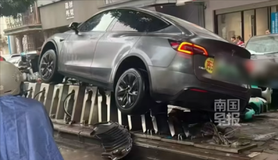 特斯拉事故骑到共享自行车头上 女司机在车上被吓哭